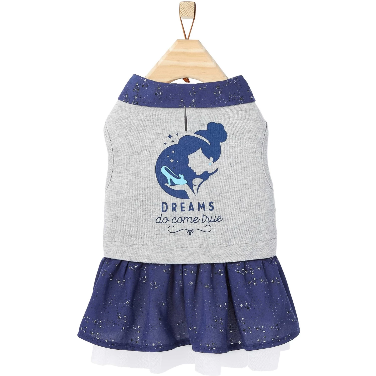 - Features a screen-printed graphic, a metallic sparkle print on the collar and skirt, and tulle under the skirt, as well as a leash hole.