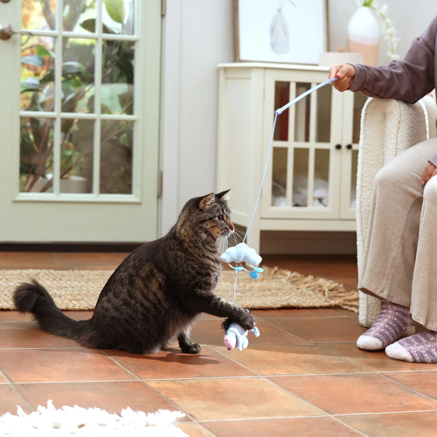 - Stimulate your cat’s body and mind as they run around or leap into the air after their new best friend.
