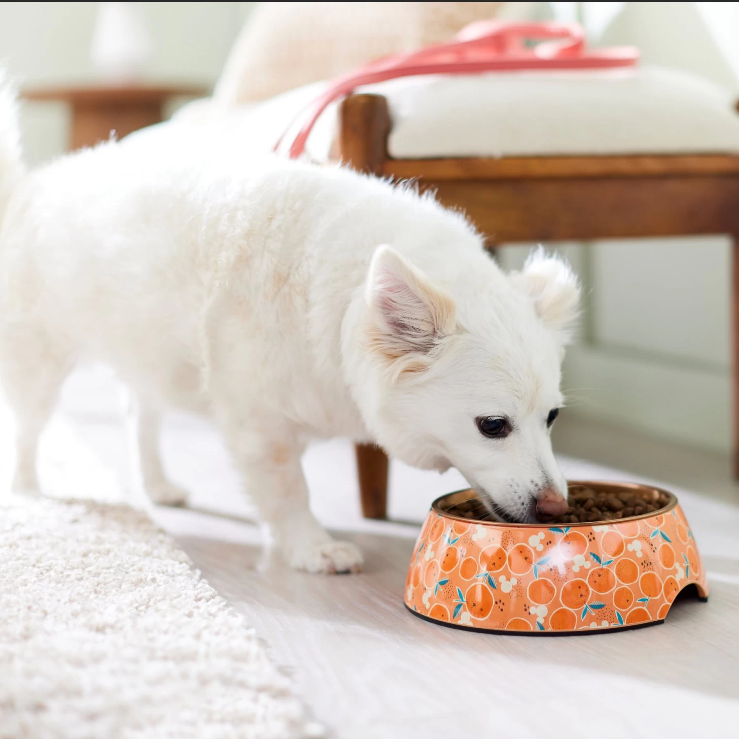 - This bamboo melamine base comes in orange with little white Mickey heads and oranges all over that will elevate your dog’s dining experience.
