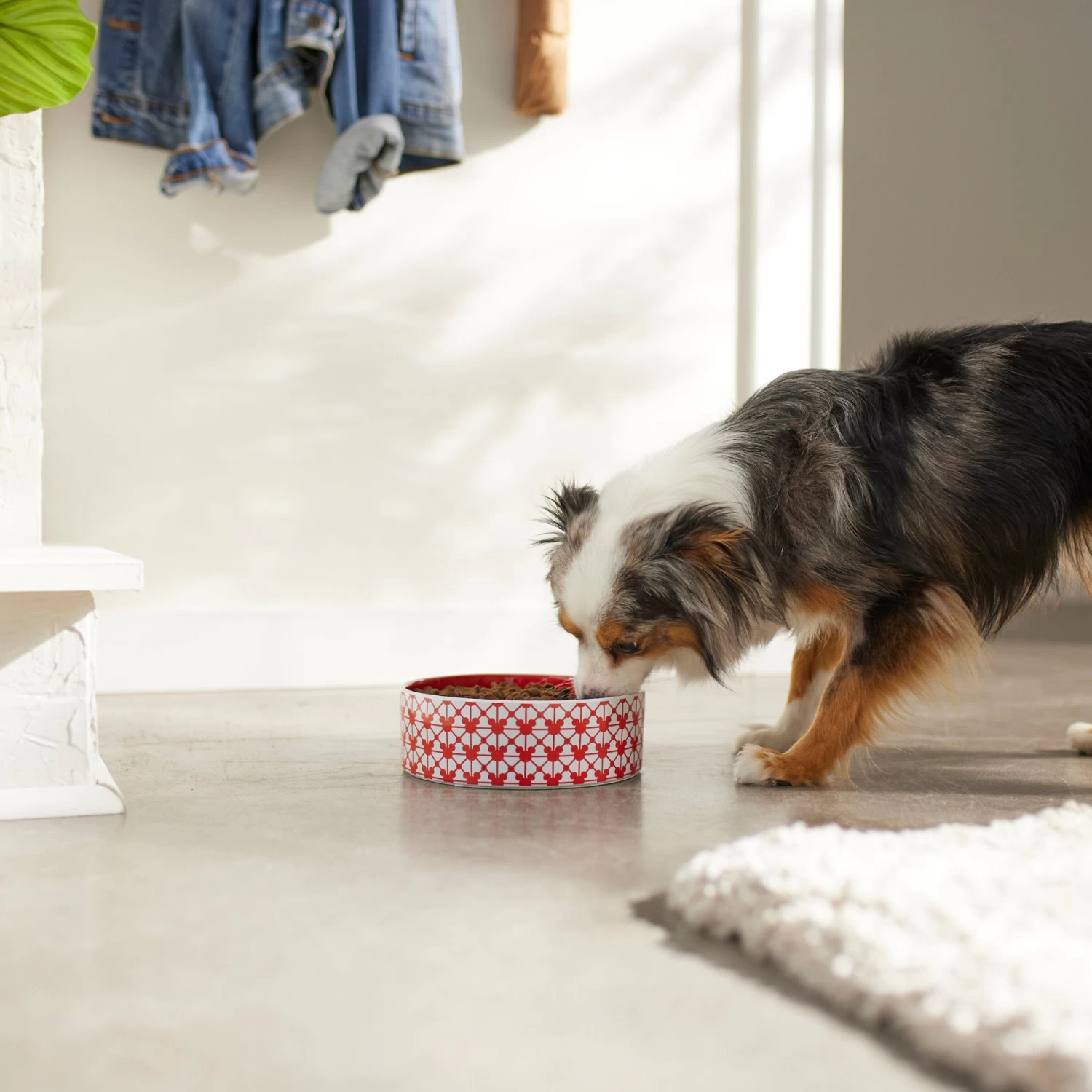 - Dog and cat bowl with a red, deco-style Mickey Mouse pattern.