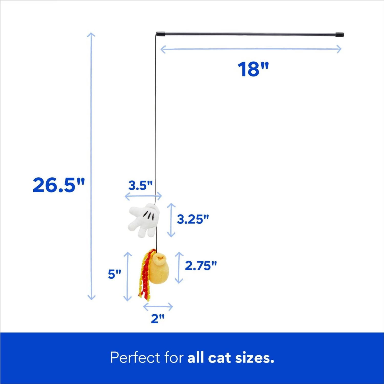 - Features a wand with stuffed Mickey Mouse shoe and glove toys and curly strings attached.