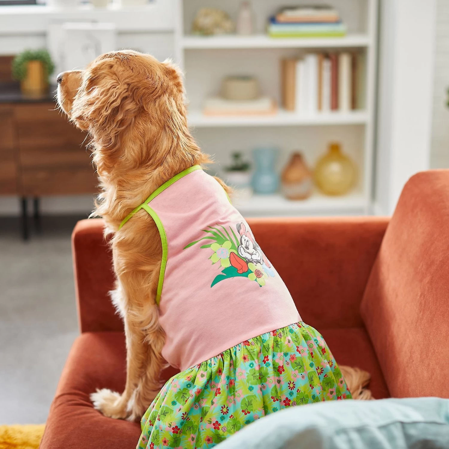 - Pet dress with floral pattern skirt and screen printed Minnie Mouse is the perfect summer outfit for your furry fan. Available only at Chewy.