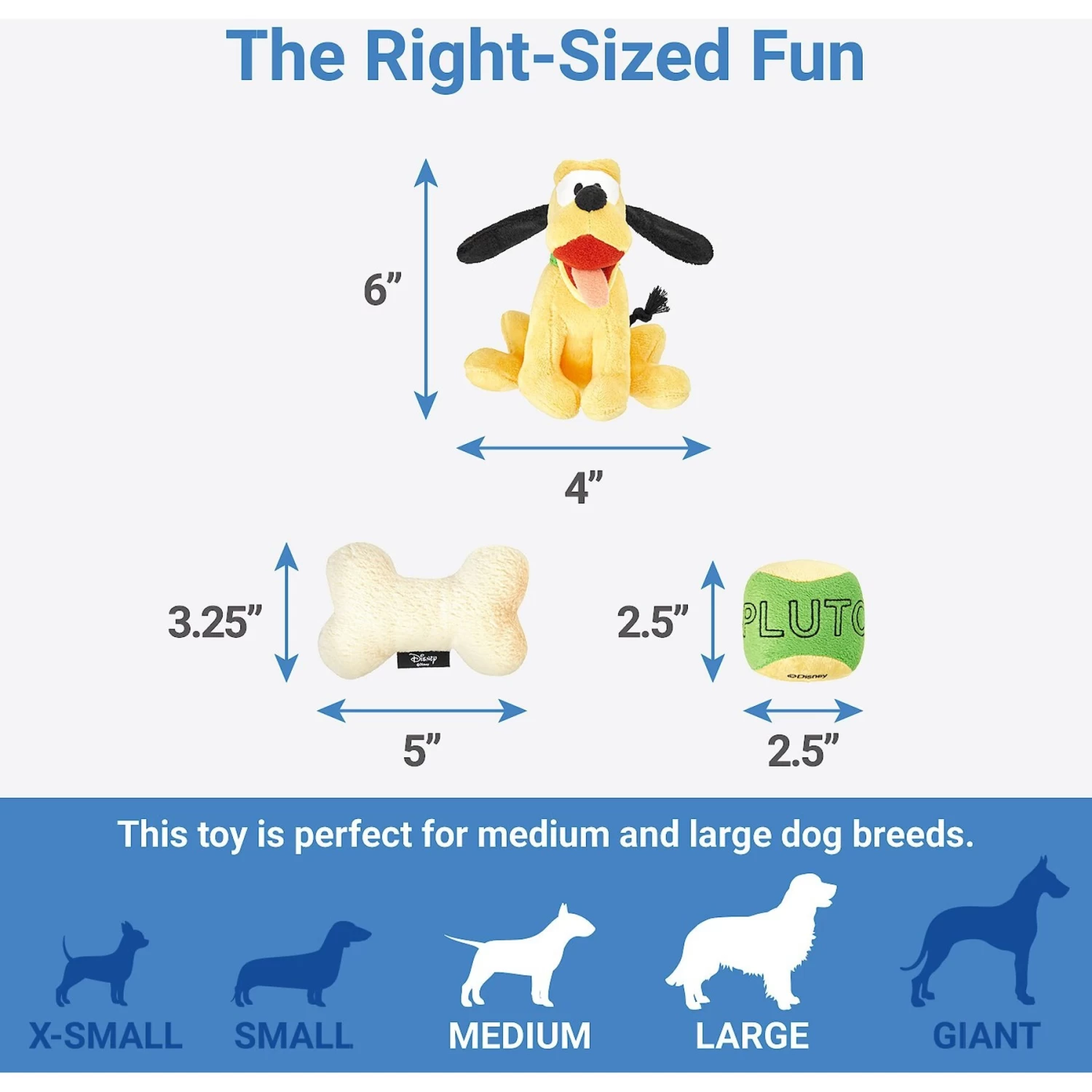 - Plush puzzle toy includes plush doghouse base, Pluto toy with crinkle paper ears, doggy bone and ball.